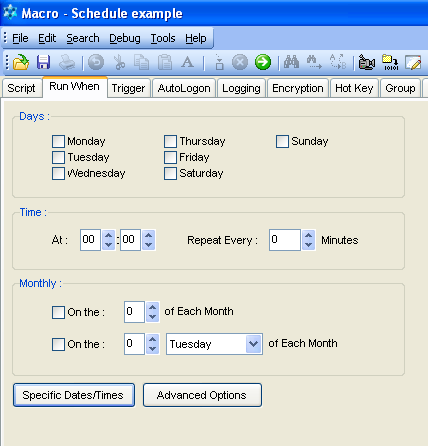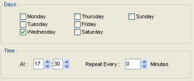 Mark off the days on which you want the macro to run and enter a time. The time must be entered in 24 hour notation. If you want the macro to be repeated enter an appropriate value in the 'repeat every' box. If you don't want it repeated simply leave this set to zero. The repeat every box allows you to specify up to 1440 minutes (a full day).