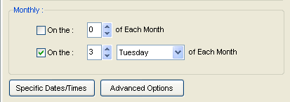 To make the macro run on a monthly basis check the monthly box and enter the day of the month on which you want the macro invoked. Filling in the time section will allow you to specify what time the macro will run, on those matching days.