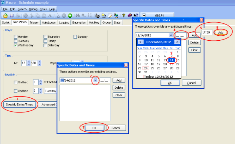 To set a macro to run at a specific date and time, simply follow the seven steps below. Multiple dates and times can be added. They can be removed easily by using the delete and clear buttons.